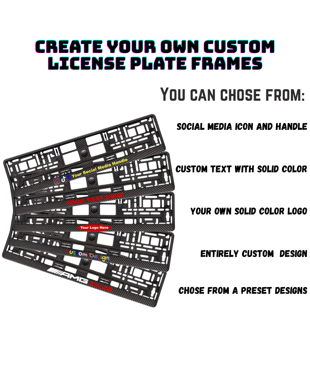 Custom License Plate Frames in carbon style, gloss black or basic black....